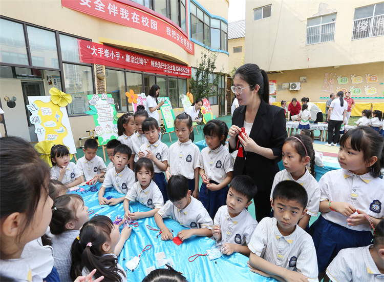 杞县纪委监委将把“廉洁文化进校园”作为一项长期、持久、重要的工作来抓,推动相关部门及辖区中小学校、幼儿园将廉洁文化与校园文化、师德教育、教育教学等工作相结合,有重点、全方位、多层次地开展廉洁文化进校园系列活动。图为该县纪委监委在杞县县直机关幼儿园开展“大手牵小手•廉洁过端午”活动。(邵金忠 摄)