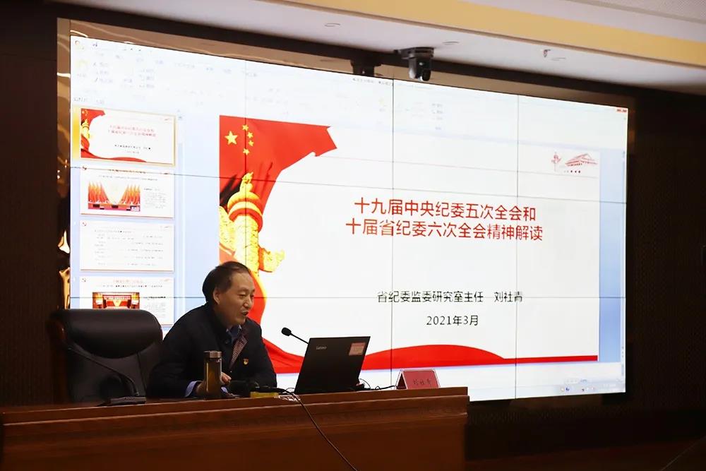 其间,省纪委监委研究室刘社青主任受邀进行了《十九届中央纪委五次全会和十届省纪委六次全会精神解读》授课,就深刻理解中央纪委、省纪委两级全会召开的背景和主题、深刻理解党风廉政建设和反腐败斗争面临的严峻复杂形势、深刻理解2021年纪检监察重点工作任务等方面内容进行精彩阐述。