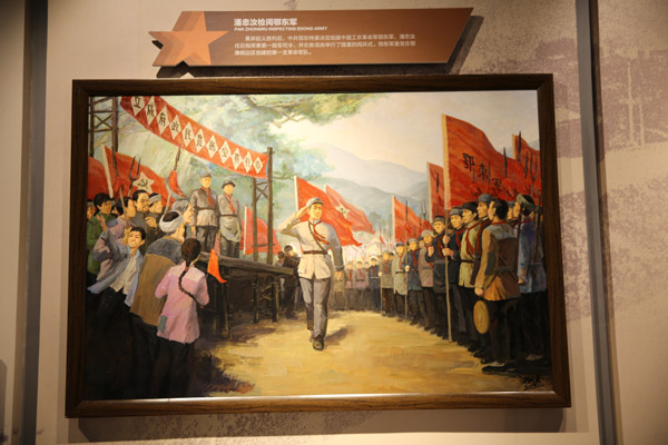 这幅油画展现了英烈潘忠汝检阅鄂东军时的情景。