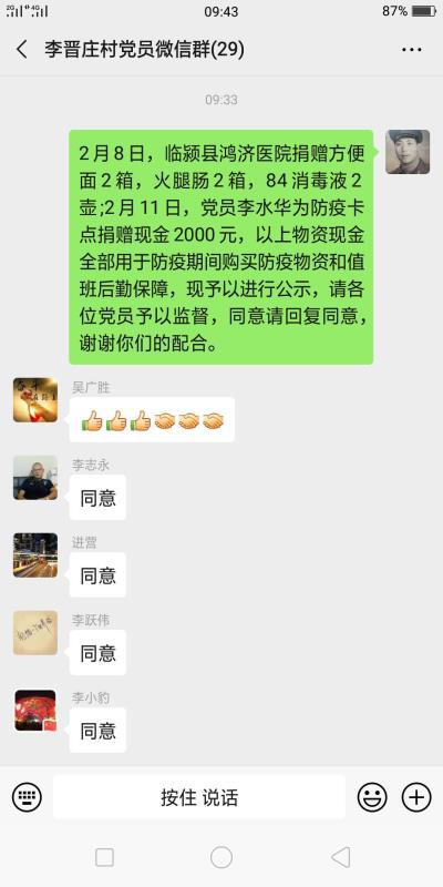 巨陵镇李晋庄针对捐赠财物使用明细在微信群进行公开