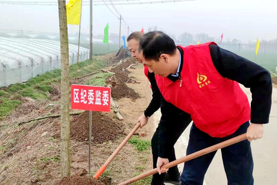 植树现场,红旗飘扬,干部职工个个热情洋溢、干劲十足,大家仔细检查树木培栽情况,每一道工序都一丝不苟,运苗、挖坑、扶埋、填土,分工协作、有条不紊,干劲十足,到处是一片热火朝天的劳动场景。经过近两个小时的努力,一排排整齐划一、亭亭玉立、充满生机的树苗在明媚的春光中展现在了人们面前,传递着春天的气息与活力。该区纪委监委办公室副主任李东海表示:“我们为生态修复而植树,种树就是种幸福、植树于行,植廉于心。”