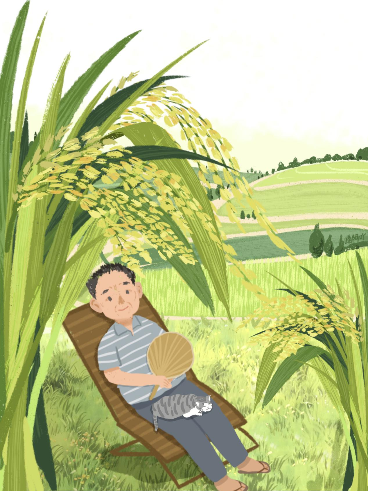 “他进入了一个梦乡,那里的稻穗比高粱还高,穗粒比花生还大。风轻轻吹过,他就坐在稻穗下乘凉。”(源汇区纪委监委 插画:袁翊君)