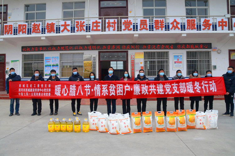 寒冬腊八节、传递温暖意。为让困难家庭感受到党和政府的温暖和关怀,让每一位困难群众过上欢乐祥和的春节,1月20日上午,西城区纪工委党支部、漯河市西城建设投资中心党支部联合和中建七局一公司河南公司党委联合开展“暖心腊八节·情系贫困户·廉政共建党支部暖冬活动”,赴阴阳赵镇大张庄村为辖区贫困户、困难党员等25户村民送上米面粮油等慰问物品。