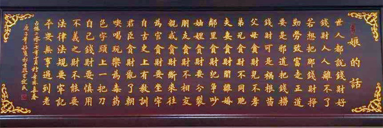 丈夫临死前拉着她的手:“我走后,你要操持好这个家。尤其是要替我看好孩子的乌纱帽,凡是违法和违背良心事,坚决不能做。”老太太始终把这个话铭记在心,并立下规矩。孩子们把老太太的话整理成《娘的话》,刻成匾额上挂厅堂:世人都说钱财好,钱财人人离不了,若想把那钱财挣,勤劳 致富走正道,要是邪道把钱捞,钱财可是祸根苗 ...... 法律法规要牢记,平安无事过到老。“娘的话”共计 22句154字,浅显易懂却寓意深刻。我看着墙上的那块匾额,心里发出由衷的赞叹,如果每个官员都能拥有老太太这样的境界,何愁不能做到海晏河清!