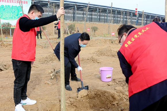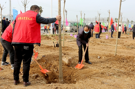 在植树现场,红旗高高飘扬,机关干部职工热情高涨,参与植树的员工仔细检查树木培栽情况,每一道工序都一丝不苟,运苗、挖坑、扶埋、填土,分工协作、有条不紊、干劲十足,到处是一片热火朝天的劳动场景。经过近两个小时的努力,全区共栽植国槐、白蜡、大叶女贞等共计1000余株树苗,栽种的树苗一排排整齐划一、充满生机,传递着春天的气息与活力。