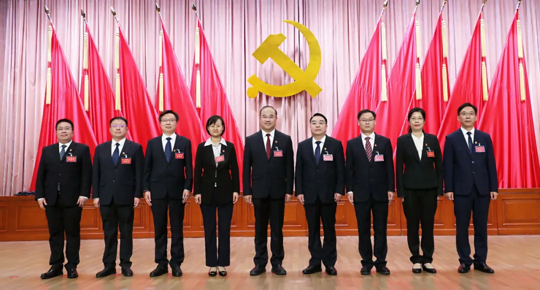 新当选的中国共产党漯河市第八届纪律检查委员会常务委员会委员师维(左五)、李乾(右四)、孙向阳(左四)、郭书耀(右三)、张向东(左三)、燕红(右二)、赵彬(左二)、李彬伟(右一)、胡亚斌(左一)。