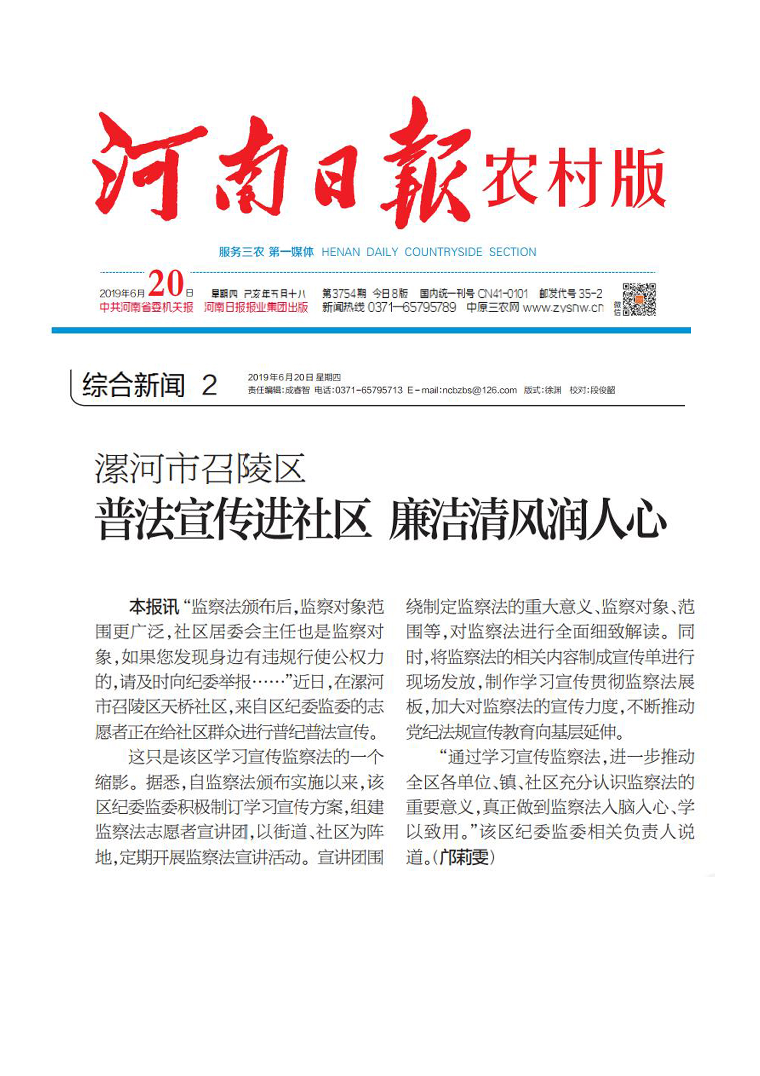 本报讯“监察法颁布后,监察对象范围更广泛,社区居委会主任也是监察对象,如果您发现身边有违规行使公权力的,请及时向纪委举报……”近日,在漯河市召陵区天桥社区,来自区纪委监委的志愿者正在给社区群众进行普纪普法宣传。