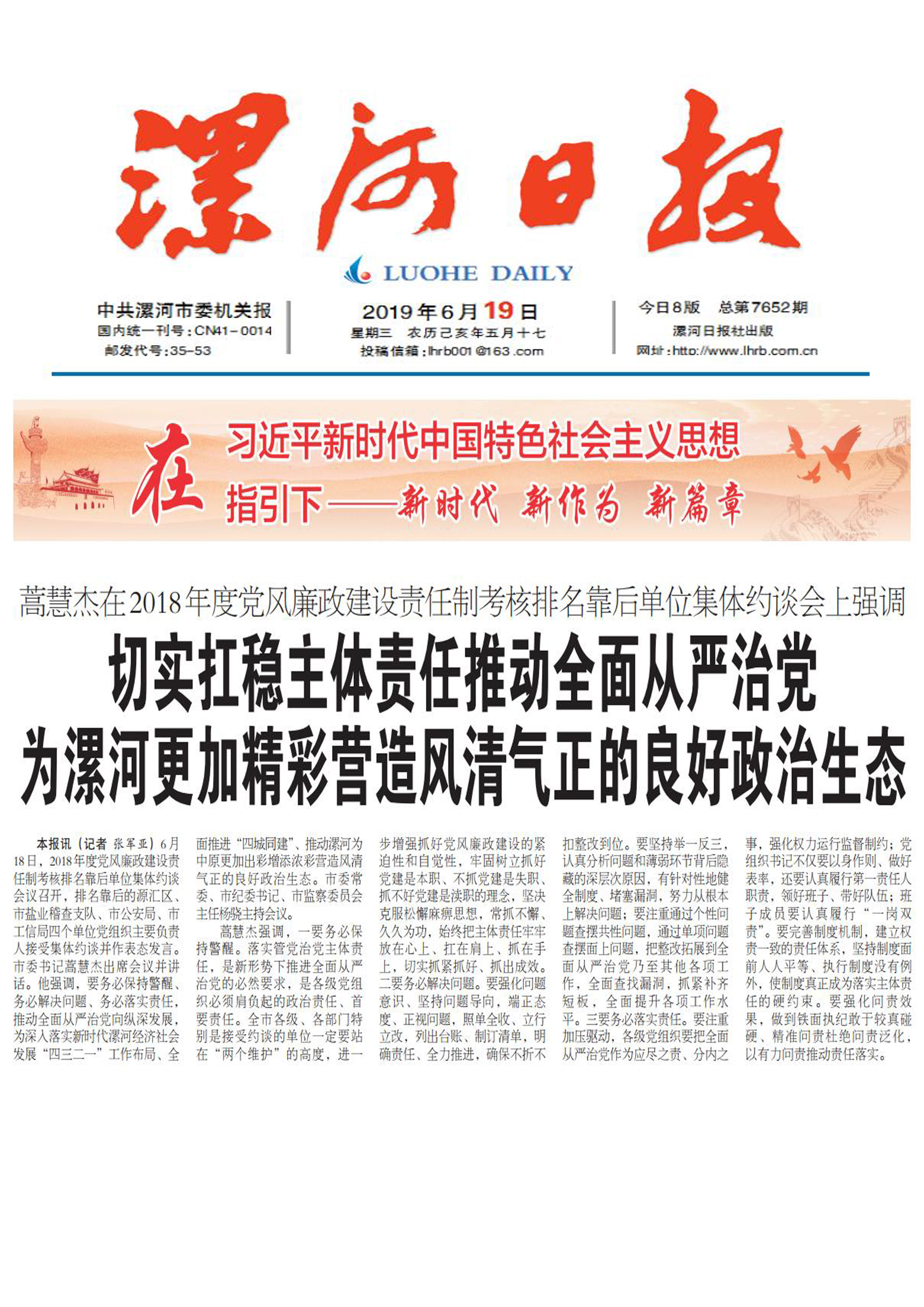 本报讯(记者 张军亚)6月18日,2018年度党风廉政建设责任制考核排名靠后单位集体约谈会议召开,排名靠后的源汇区、市盐业稽查支队、市公安局、市工信局四个单位党组织主要负责人接受集体约谈并作表态发言。市委书记蒿慧杰出席会议并讲话。他强调,要务必保持警醒、务必解决问题、务必落实责任,推动全面从严治党向纵深发展,为深入落实新时代漯河经济社会发展“四三二一”工作布局、全面推进“四城同建”、推动漯河为中原更加出彩增添浓彩营造风清气正的良好政治生态。市委常委、市纪委书记、市监察委员会主任杨骁主持会议。
