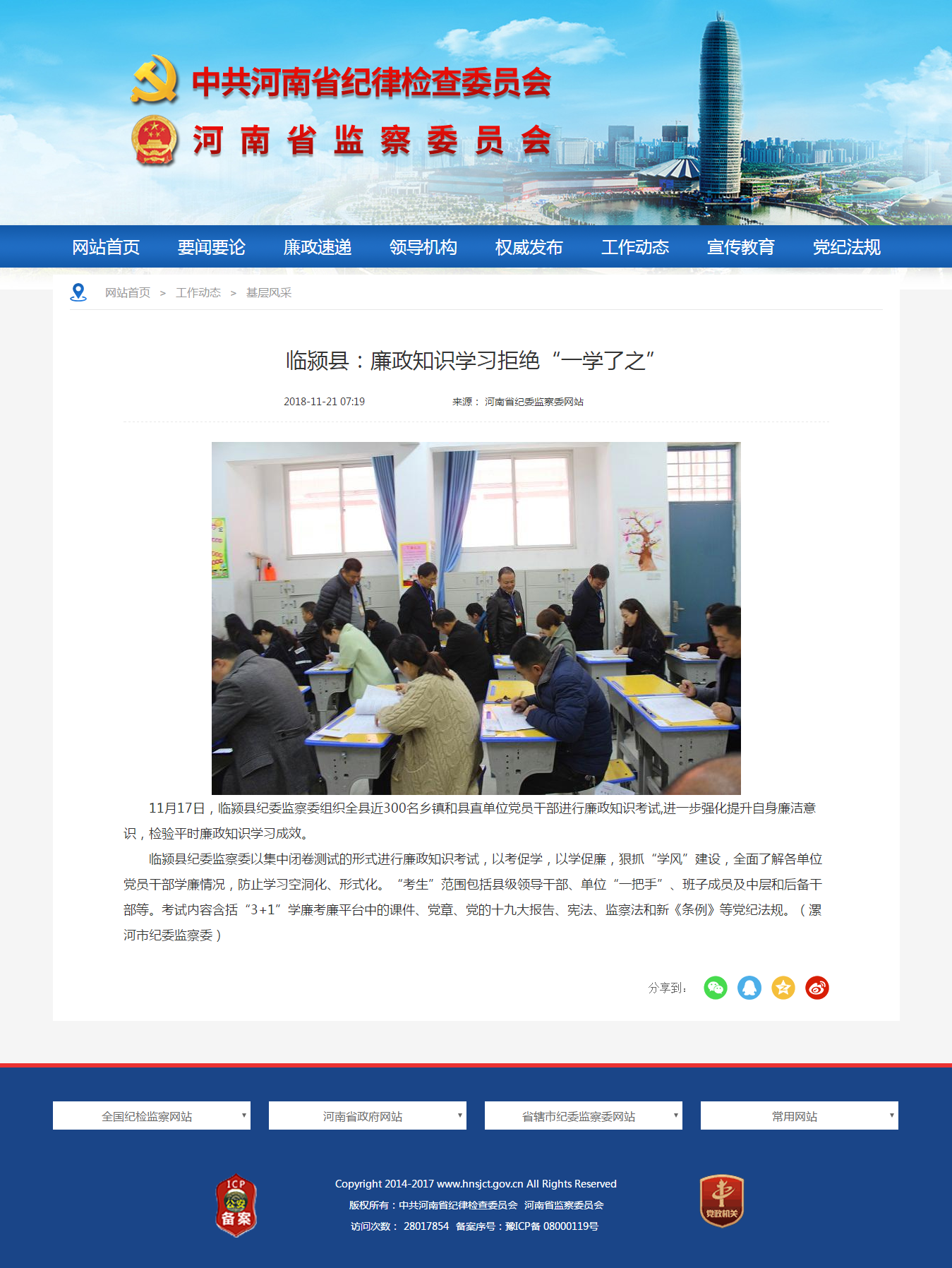临颍县纪委监察委以集中闭卷测试的形式进行廉政知识考试,以考促学,以学促廉,狠抓“学风”建设,全面了解各单位党员干部学廉情况,防止学习空洞化、形式化。“考生”范围包括县级领导干部、单位“一把手”、班子成员及中层和后备干部等。考试内容含括“3+1”学廉考廉平台中的课件、党章、党的十九大报告、宪法、监察法和新《条例》等党纪法规。(漯河市纪委监察委)