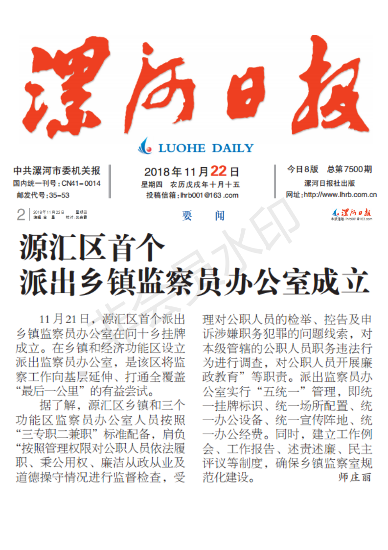 11月21日,源汇区首个派出乡镇监察员办公室在问十乡挂牌成立。在乡镇和经济功能区设立派出监察员办公室,是该区将监察工作向基层延伸、打通全覆盖“最后一公里”的有益尝试。