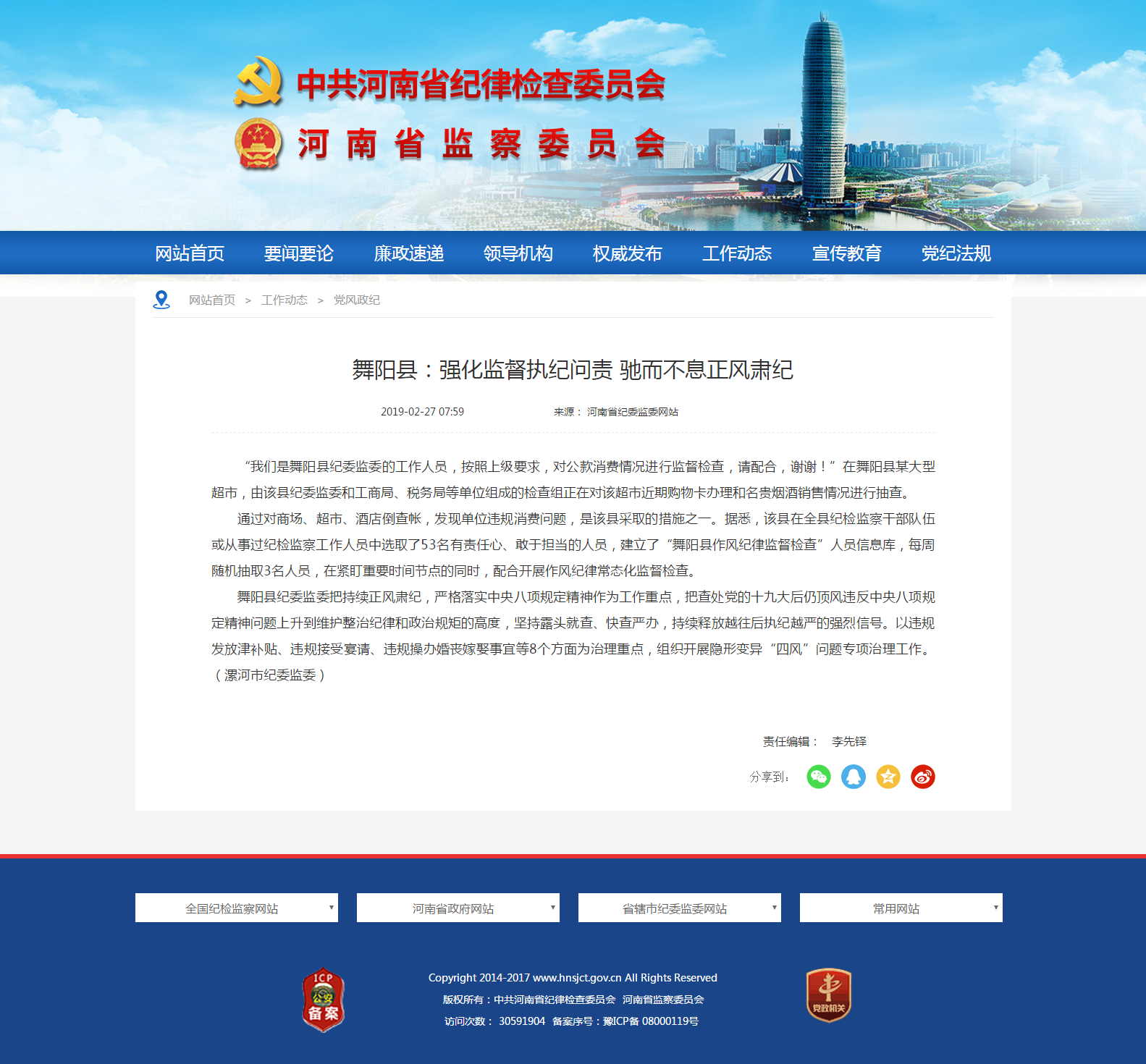舞阳县纪委监委把持续正风肃纪,严格落实中央八项规定精神作为工作重点,把查处党的十九大后仍顶风违反中央八项规定精神问题上升到维护整治纪律和政治规矩的高度,坚持露头就查、快查严办,持续释放越往后执纪越严的强烈信号。以违规发放津补贴、违规接受宴请、违规操办婚丧嫁娶事宜等8个方面为治理重点,组织开展隐形变异“四风”问题专项治理工作。(漯河市纪委监委)