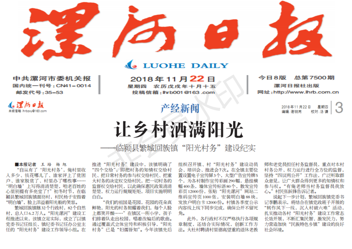 “自从有了‘阳光村务’,俺村里收入多少、钱花哪儿了、谁家评上了贫困户、谁家脱贫了、村里办了哪些事……‘明白墙’上写得清清楚楚,咱老百姓的心里别提有多亮堂了!”初冬时节,在临颍县繁城回族镇面坊村,村民杨子安指着“明白墙”,脸上洋溢着阳光般的笑容。