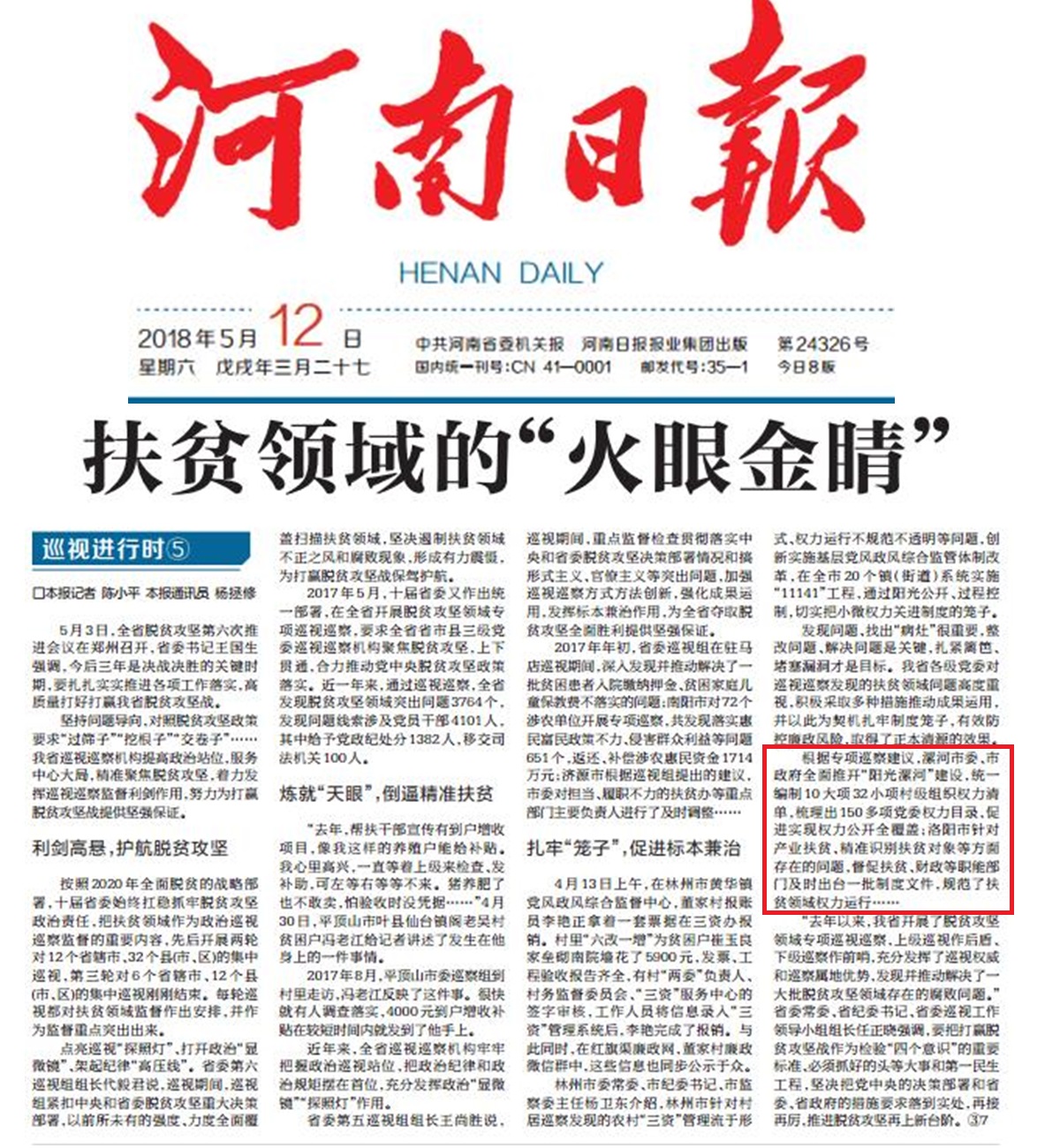 2017年年初,省委巡视组在驻马店巡视期间,深入发现并推动解决了一批贫困患者入院缴纳押金、贫困家庭儿童保教费不落实的问题;南阳市对72个涉农单位开展专项巡察,共发现落实惠民富民政策不力、侵害群众利益等问题651个,返还、补偿涉农惠民资金1714万元;济源市根据巡视组提出的建议,市委对担当、履职不力的扶贫办等重点部门主要负责人进行了及时调整……