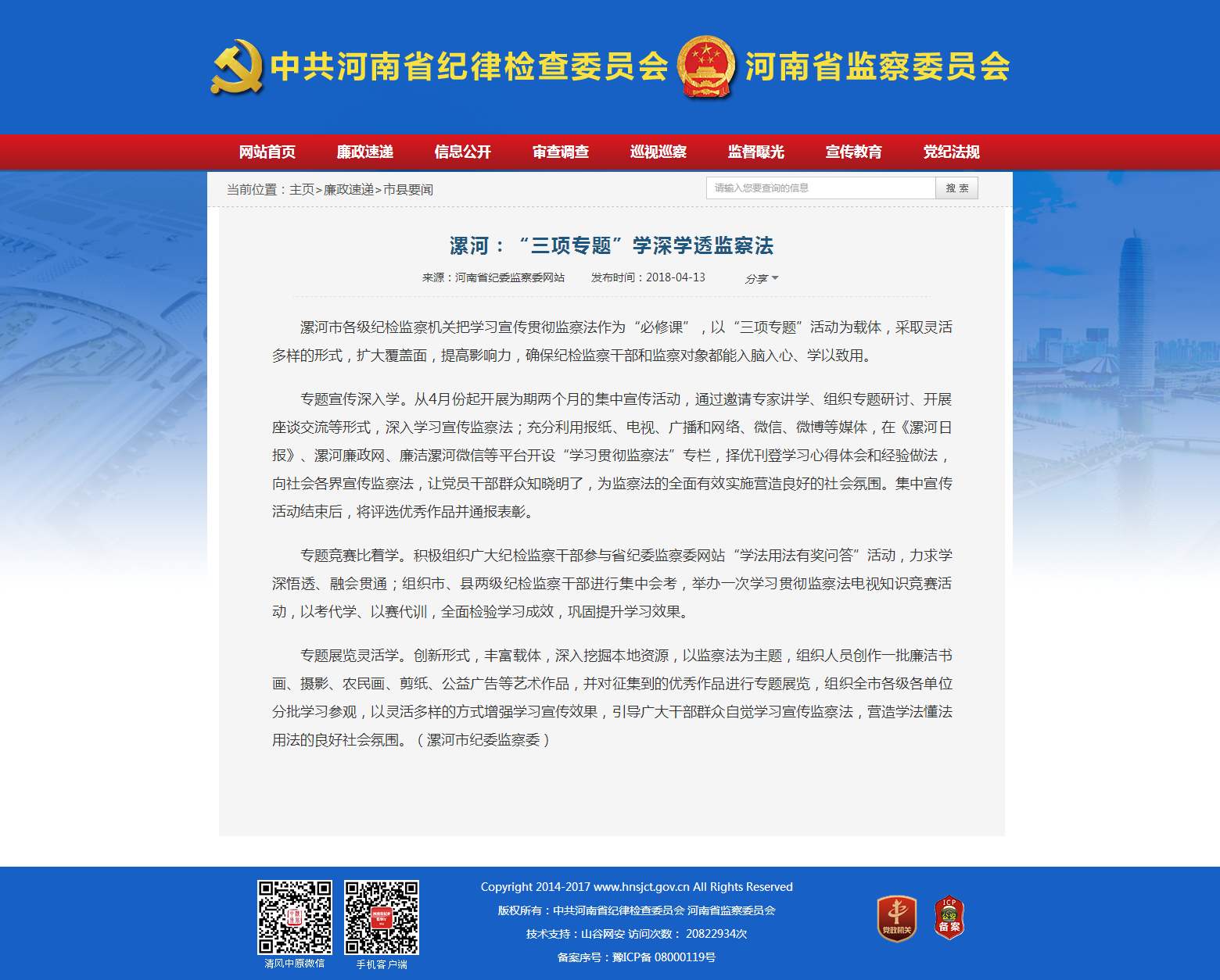 专题宣传深入学。从4月份起开展为期两个月的集中宣传活动,通过邀请专家讲学、组织专题研讨、开展座谈交流等形式,深入学习宣传监察法;充分利用报纸、电视、广播和网络、微信、微博等媒体,在《漯河日报》、漯河廉政网、廉洁漯河微信等平台开设“学习贯彻监察法”专栏,择优刊登学习心得体会和经验做法,向社会各界宣传监察法,让党员干部群众知晓明了,为监察法的全面有效实施营造良好的社会氛围。集中宣传活动结束后,将评选优秀作品并通报表彰。