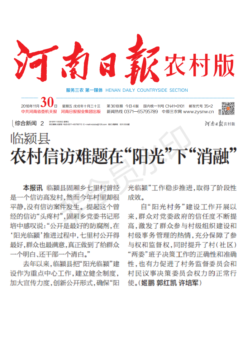 临颍县固厢乡七里村曾经是一个信访高发村,然而今年村里却很平静,没有信访案件发生。提起这个曾经的信访“头疼村”,固厢乡党委书记邢培中感叹说:“公开是最好的防腐剂,在‘阳光临颍’推进过程中,七里村公开得最好,群众也最满意,真正做到了给群众一个明白、还干部一个清白。”