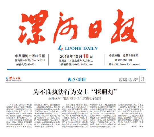 今年以来,召陵区对“依职权事项”实施电子监察,要求各单位必须严格按照时间节点,在行政执法行为发生后3至5个工作日内将处理结果上传至阳光召陵网,接受群众监督,为不良执法行为安上了一盏“探照灯”。
