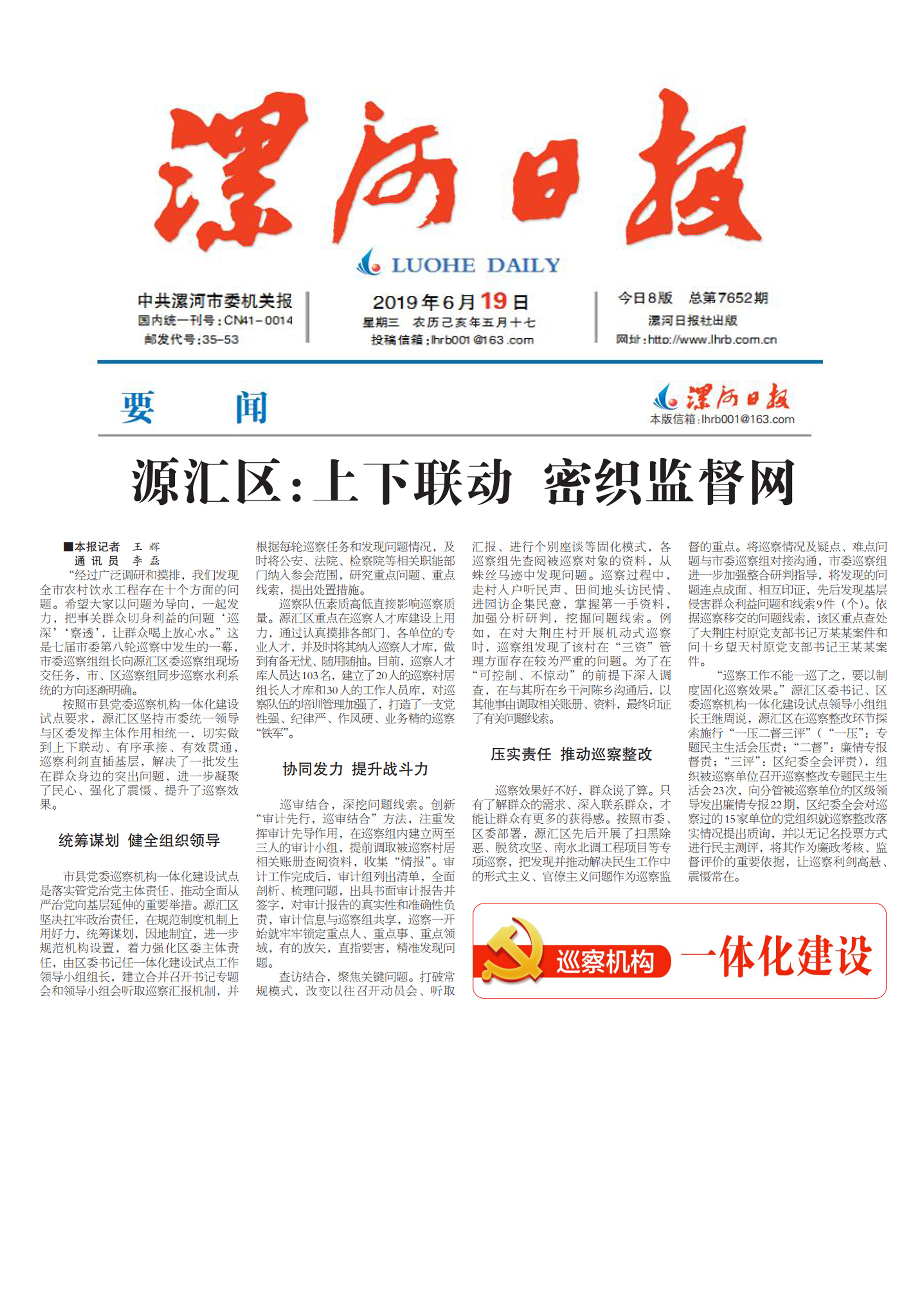 市县党委巡察机构一体化建设试点是落实管党治党主体责任、推动全面从严治党向基层延伸的重要举措。源汇区坚决扛牢政治责任,在规范制度机制上用好力,统筹谋划,因地制宜,进一步规范机构设置,着力强化区委主体责任,由区委书记任一体化建设试点工作领导小组组长,建立合并召开书记专题会和领导小组会听取巡察汇报机制,并根据每轮巡察任务和发现问题情况,及时将公安、法院、检察院等相关职能部门纳入参会范围,研究重点问题、重点线索,提出处置措施。