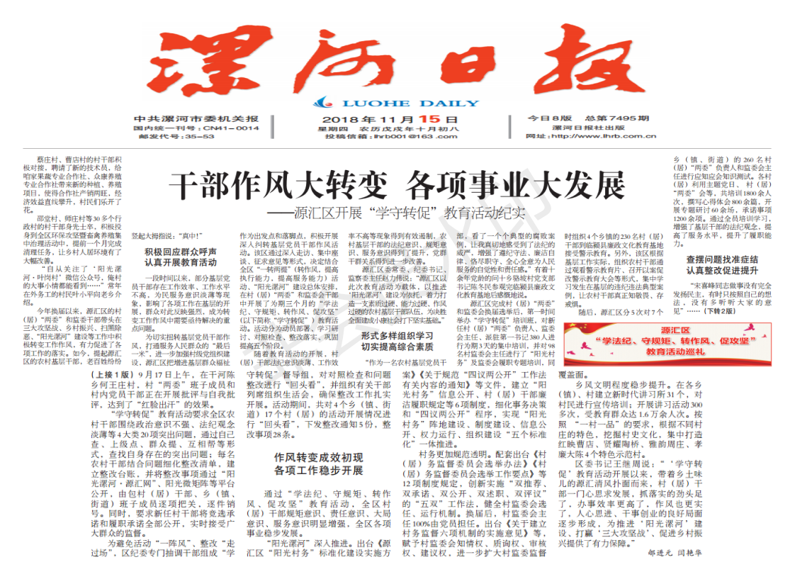 区委书记王继周说:“‘学守转促’教育活动开展以来,带着乡土味儿的源汇清风扑面而来,村(居)干部一门心思求发展,抓落实的劲头足了,办事效率更高了,作风也更实了,人心思进、干事创业的良好局面逐步形成,为推进‘阳光漯河’建设、打赢‘三大攻坚战’、促进乡村振兴提供了有力保障。”