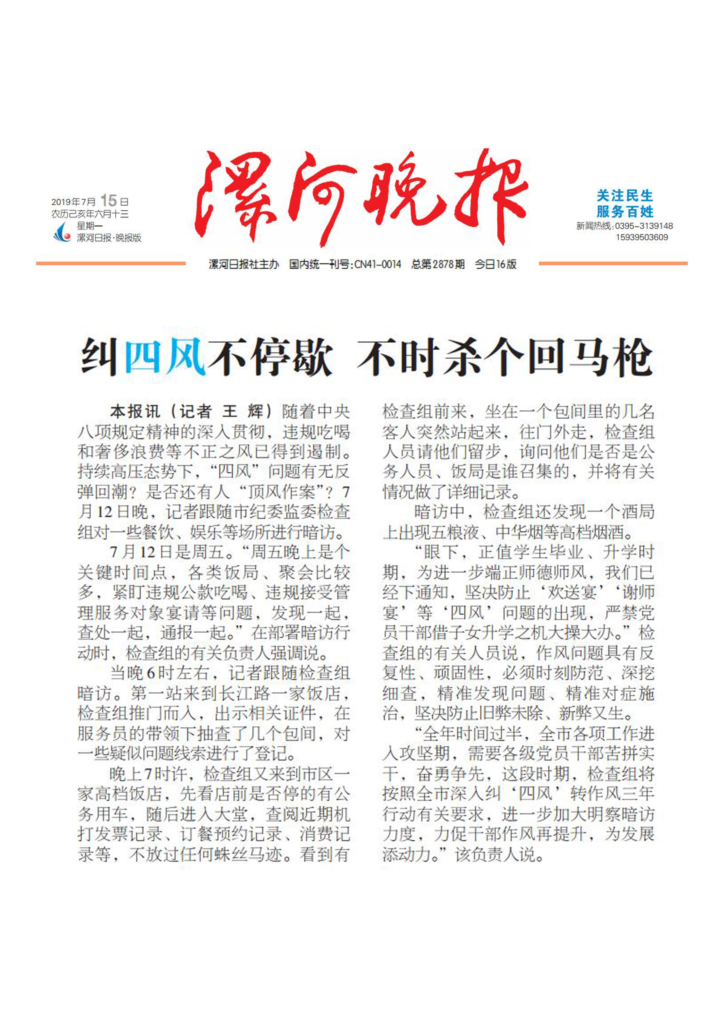 本报讯(记者 王 辉)随着中央八项规定精神的深入贯彻,违规吃喝和奢侈浪费等不正之风已得到遏制。持续高压态势下,“四风”问题有无反弹回潮?是否还有人“顶风作案”?7月12日晚,记者跟随市纪委监委检查组对一些餐饮、娱乐等场所进行暗访。