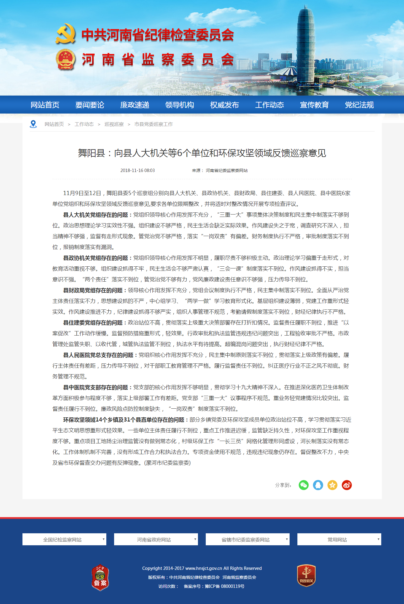 11月9日至12日,舞阳县委5个巡察组分别向县人大机关、县政协机关、县财政局、县住建委、县人民医院、县中医院6家单位党组织和环保攻坚领域反馈巡察意见,要求各单位限期整改,并将适时对整改情况开展专项检查评议。