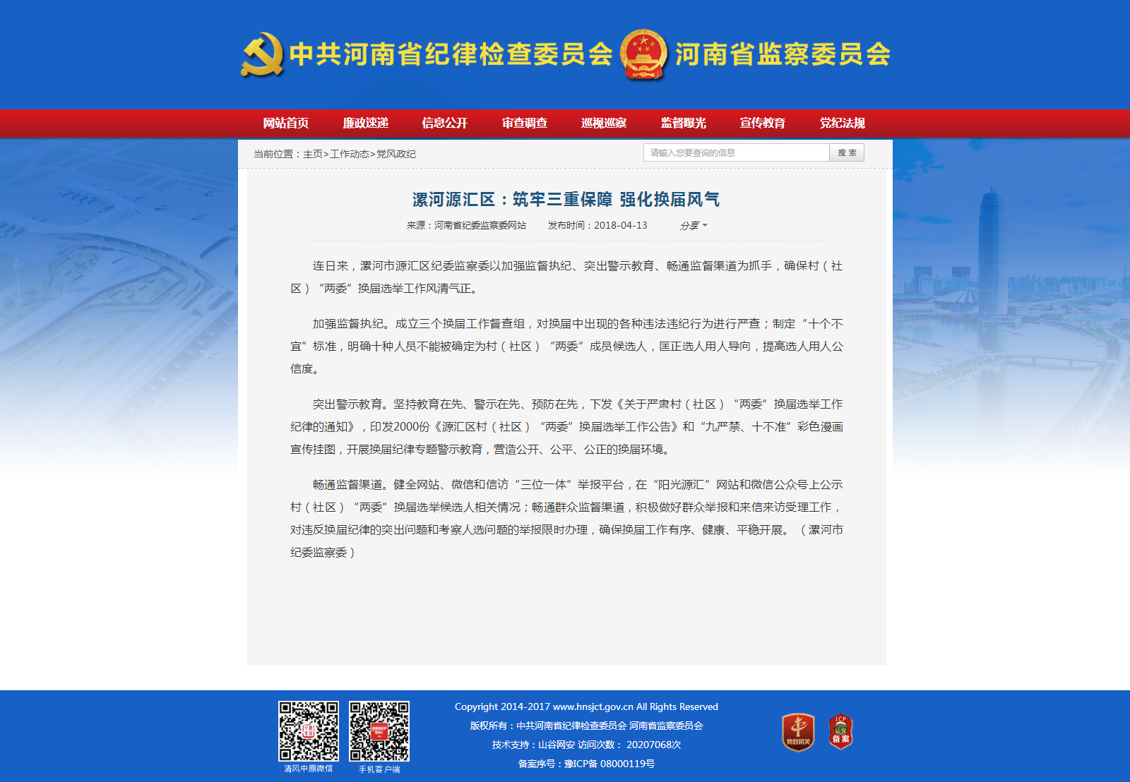 畅通监督渠道。健全网站、微信和信访“三位一体”举报平台,在“阳光源汇”网站和微信公众号上公示村(社区)“两委”换届选举候选人相关情况;畅通群众监督渠道,积极做好群众举报和来信来访受理工作,对违反换届纪律的突出问题和考察人选问题的举报限时办理,确保换届工作有序、健康、平稳开展。(漯河市纪委监察委)