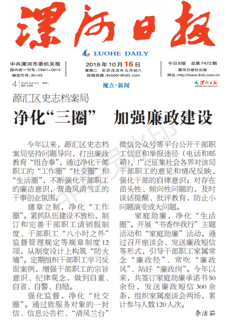 【漯河日报】源汇区:源汇区史志档案局 净化“三圈” 加强廉政建设