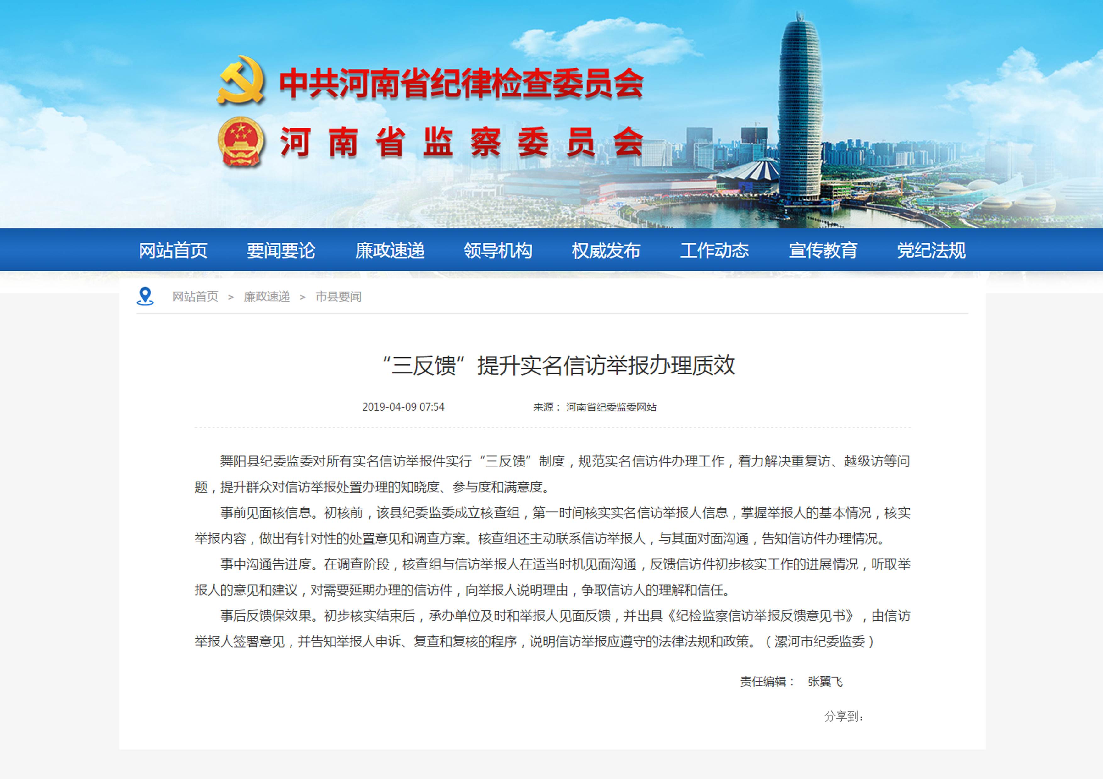 事后反馈保效果。初步核实结束后,承办单位及时和举报人见面反馈,并出具《纪检监察信访举报反馈意见书》,由信访举报人签署意见,并告知举报人申诉、复查和复核的程序,说明信访举报应遵守的法律法规和政策。(漯河市纪委监委)