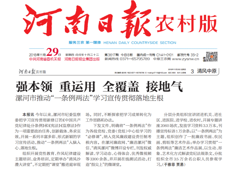 下发文件,明确将“一条例两法”作为各级党校、党委(党组)中心组学习的“必修课”,纳入党风廉政建设责任制考核内容。在漯河廉政网、“廉洁漯河”微信、“清风漯河”微博开设专栏,刊发权威解读、学习动态、心得体会、优秀微视频等3300余条,并开展在线测试活动,打造“指尖上”的微课堂。