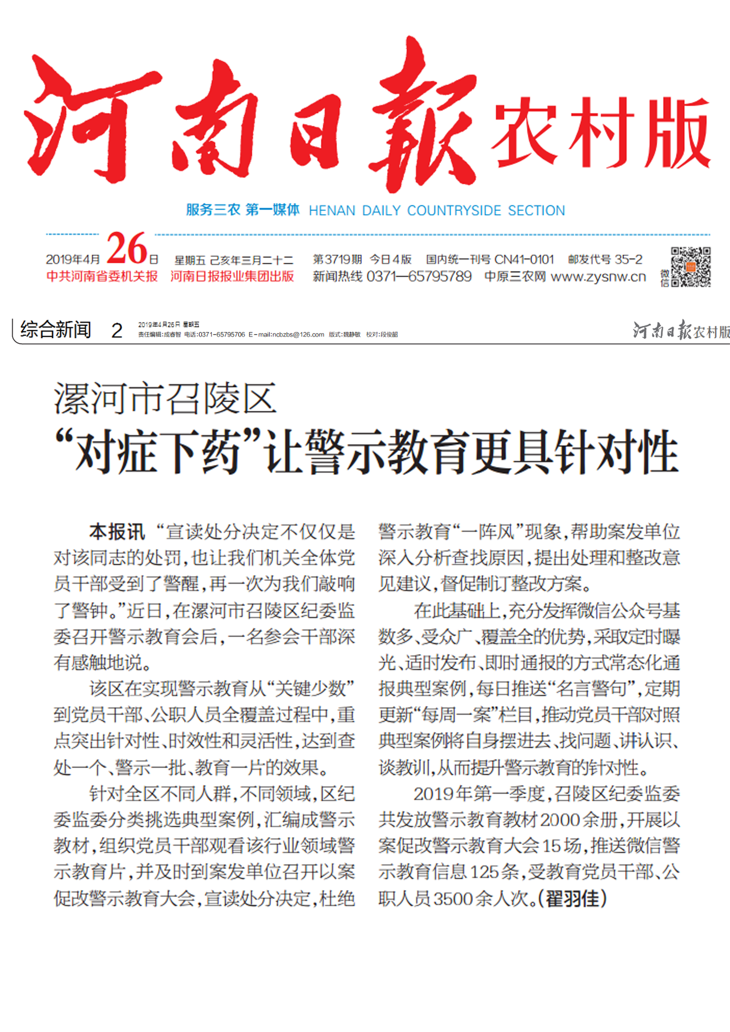 2019年第一季度,召陵区纪委监委共发放警示教育教材2000余册,开展以案促改警示教育大会15场,推送微信警示教育信息125条,受教育党员干部、公职人员3500余人次。(翟羽佳)