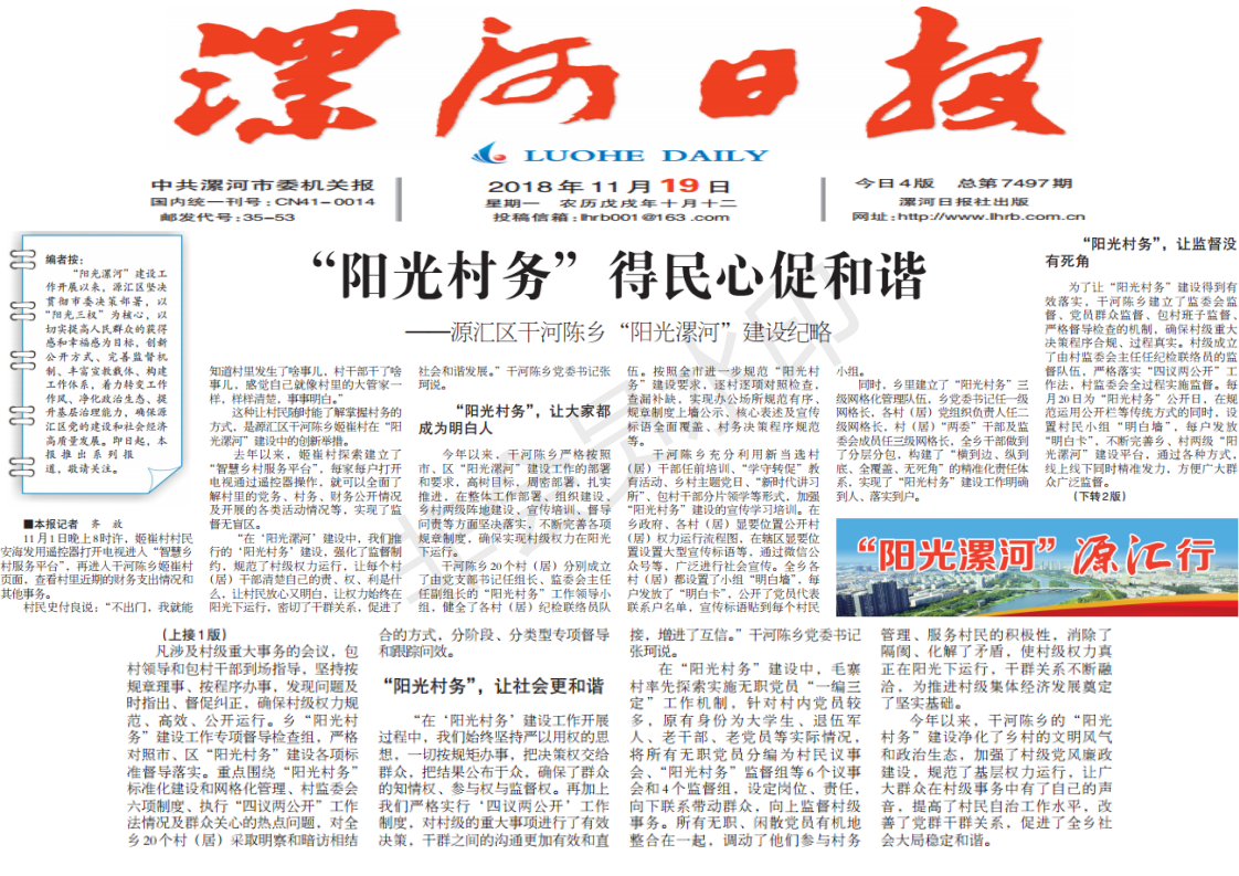 “在‘阳光漯河’建设中,我们推行的‘阳光村务’建设,强化了监督制约,规范了村级权力运行,让每个村(居)干部清楚自己的责、权、利是什么,让村民放心又明白,让权力始终在阳光下运行,密切了干群关系,促进了社会和谐发展。”干河陈乡党委书记张珂说。