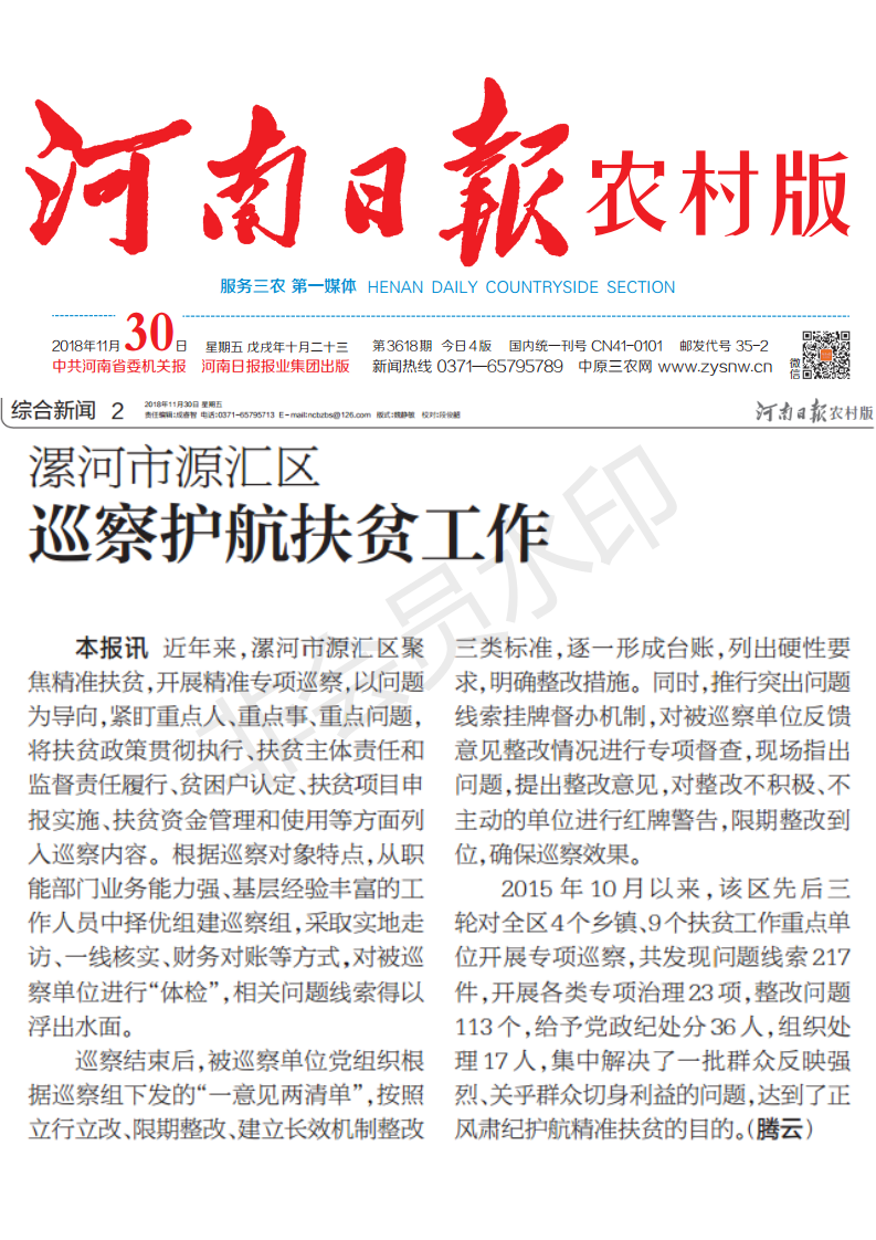 近年来,漯河市源汇区聚焦精准扶贫,开展精准专项巡察,以问题为导向,紧盯重点人、重点事、重点问题,将扶贫政策贯彻执行、扶贫主体责任和监督责任履行、贫困户认定、扶贫项目申报实施、扶贫资金管理和使用等方面列入巡察内容。根据巡察对象特点,从职能部门业务能力强、基层经验丰富的工作人员中择优组建巡察组,采取实地走访、一线核实、财务对账等方式,对被巡察单位进行“体检”,相关问题线索得以浮出水面。