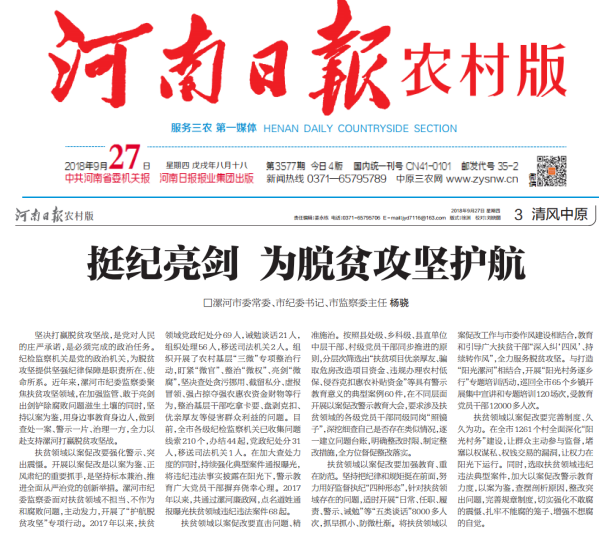 坚决打赢脱贫攻坚战,是党对人民的庄严承诺,是必须完成的政治任务。纪检监察机关是党的政治机关,为脱贫攻坚提供坚强纪律保障是职责所在、使命所系。近年来,漯河市纪委监察委聚焦扶贫攻坚领域,在加强监管、敢于亮剑出剑铲除腐败问题滋生土壤的同时,坚持以案为鉴,用身边事教育身边人,做到查处一案、警示一片、治理一方,全力以赴支持漯河打赢脱贫攻坚战。