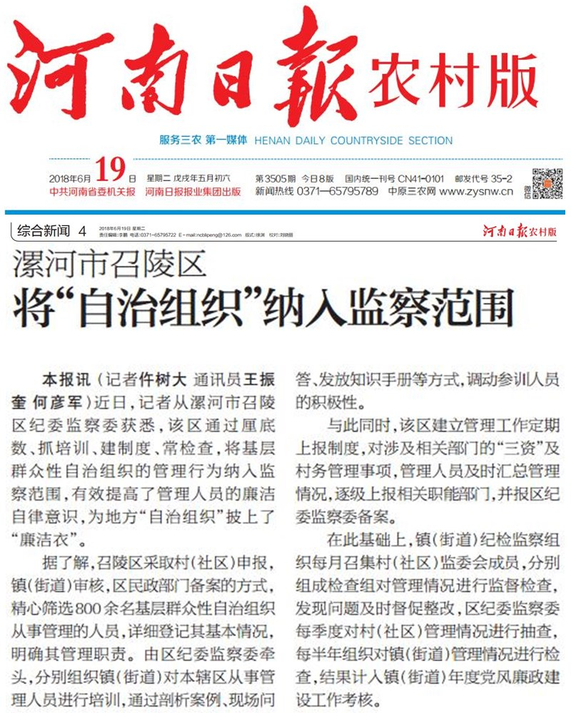 近日,记者从漯河市召陵区纪委监察委获悉,该区通过厘底数、抓培训、建制度、常检查,将基层群众性自治组织的管理行为纳入监察范围,有效提高了管理人员的廉洁自律意识,为地方“自治组织”披上了“廉洁衣”。