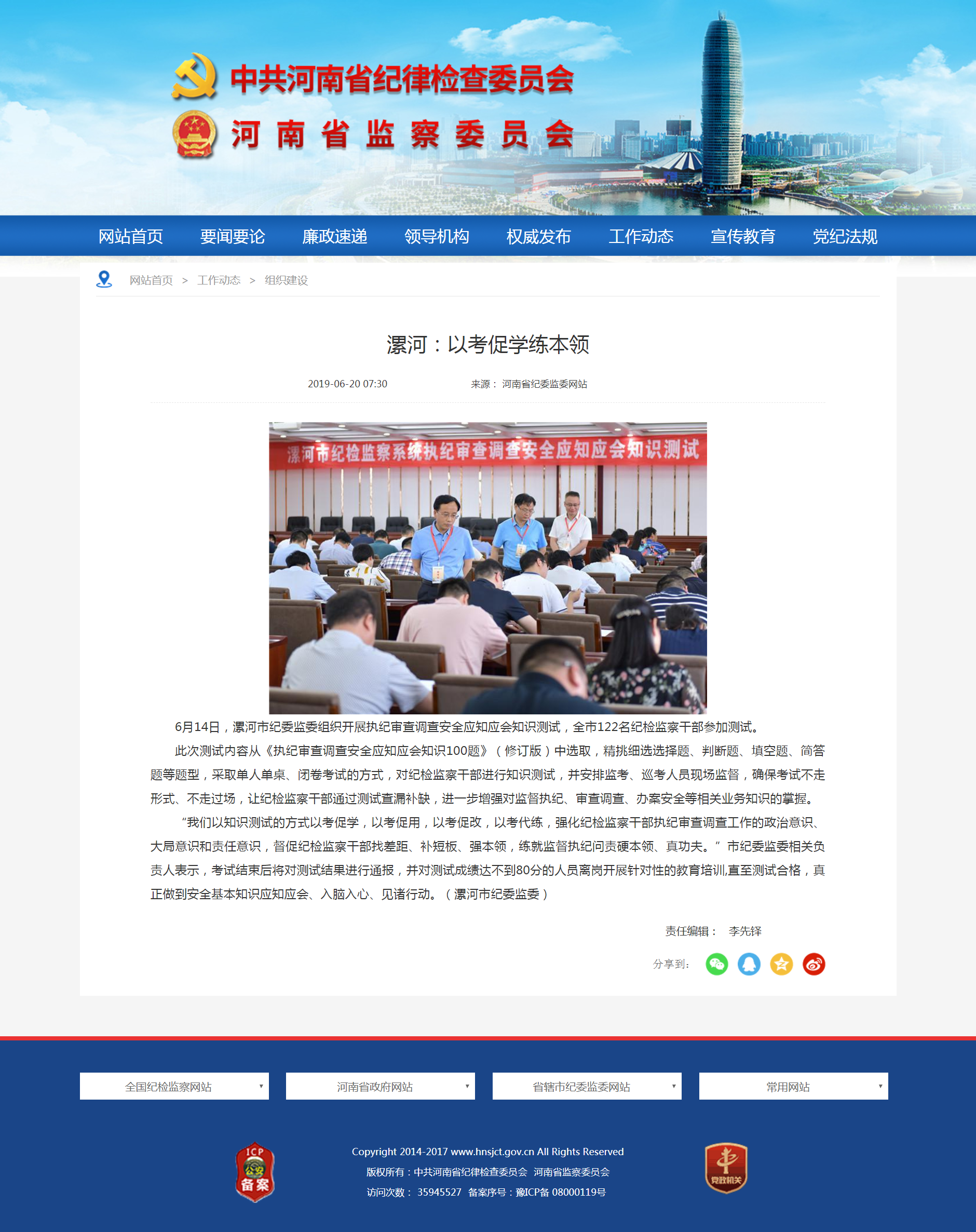 6月14日,漯河市纪委监委组织开展执纪审查调查安全应知应会知识测试,全市122名纪检监察干部参加测试。