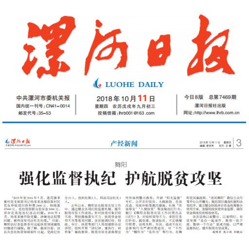 去年以来,舞阳县在脱贫攻坚工作中,通过健全各项纪检监督机制,提升脱贫攻坚工作成效。针对扶贫对象识别不准、帮扶措施落实不力、扶贫资金使用不当等易发问题,该县抽调纪检、财政、审计、扶贫等部门人员组建联合宣讲团,组织开展“讲纪律、重执行、树形象”廉政教育、脱贫攻坚先进典型宣传和案例警示教育;开辟“阳光监督”专栏,公开农村低保、大病救助、危房改造、残疾补贴等惠民措施,杜绝“优亲厚友”“人情扶贫”等违规违纪行为;制订《舞阳县脱贫攻坚工作问责办法(试行)》,对组织领导不力,承担任务打折扣、搞变通、推诿扯皮,不正确履行职责,出现失职、失误,造成不良社会影响行为严肃问责追究,对“不作为”“慢作为”“乱作为”等行为,在舞阳党风廉政网、“清风舞阳”微信公众号等平台公开曝光;规范项目遴选机制和决策程序,建立健全财政涉农资金统筹整合使用方案,加强财政扶贫资金监管,确保资金精准投放精准使用。