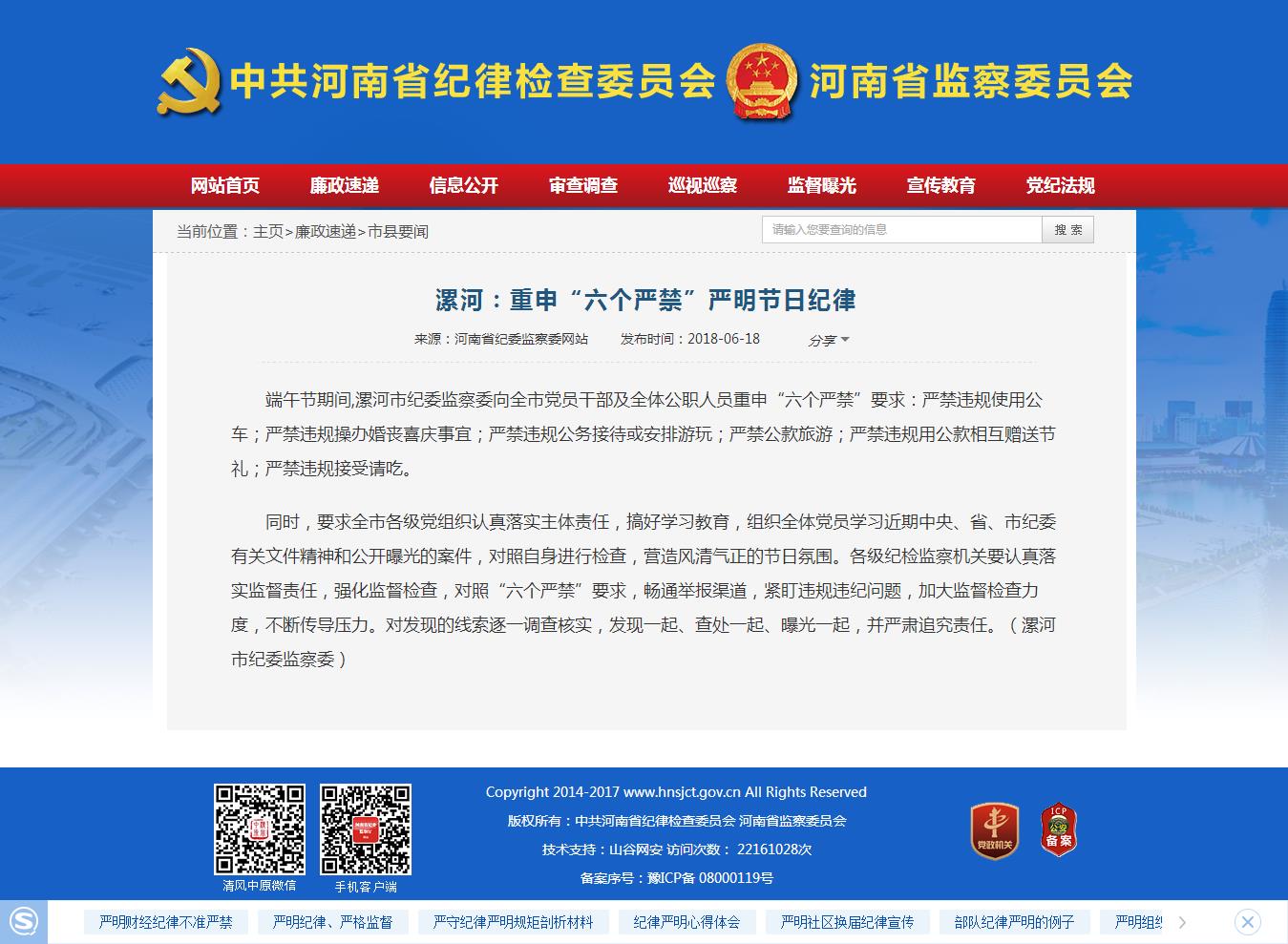 端午节期间,漯河市纪委监察委向全市党员干部及全体公职人员重申“六个严禁”要求:严禁违规使用公车;严禁违规操办婚丧喜庆事宜;严禁违规公务接待或安排游玩;严禁公款旅游;严禁违规用公款相互赠送节礼;严禁违规接受请吃。