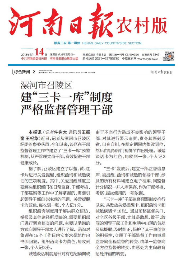 据了解,召陵区建立了以蓝、黄、红卡片进行关爱提醒、组织函询和诫勉谈话的三项制度。其中,关爱提醒制度主要解决组织部门在日常监督、干部考核、干部巡察等工作中了解掌握的、需要引起领导干部自身注意的问题。关爱提醒卡为蓝色,每收到一张,个人记1分。