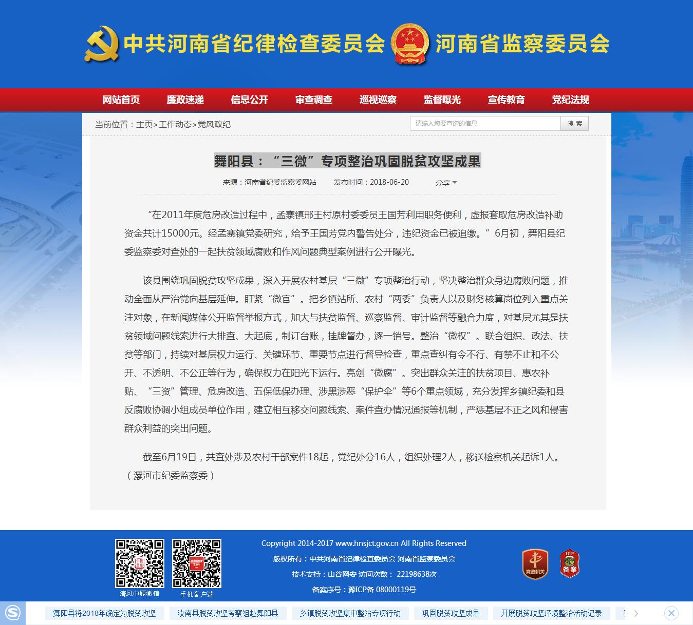 在2011年度危房改造过程中,孟寨镇邢王村原村委委员王国芳利用职务便利,虚报套取危房改造补助资金共计15000元。经孟寨镇党委研究,给予王国芳党内警告处分,违纪资金已被追缴。”6月初,舞阳县纪委监察委对查处的一起扶贫领域腐败和作风问题典型案例进行公开曝光。