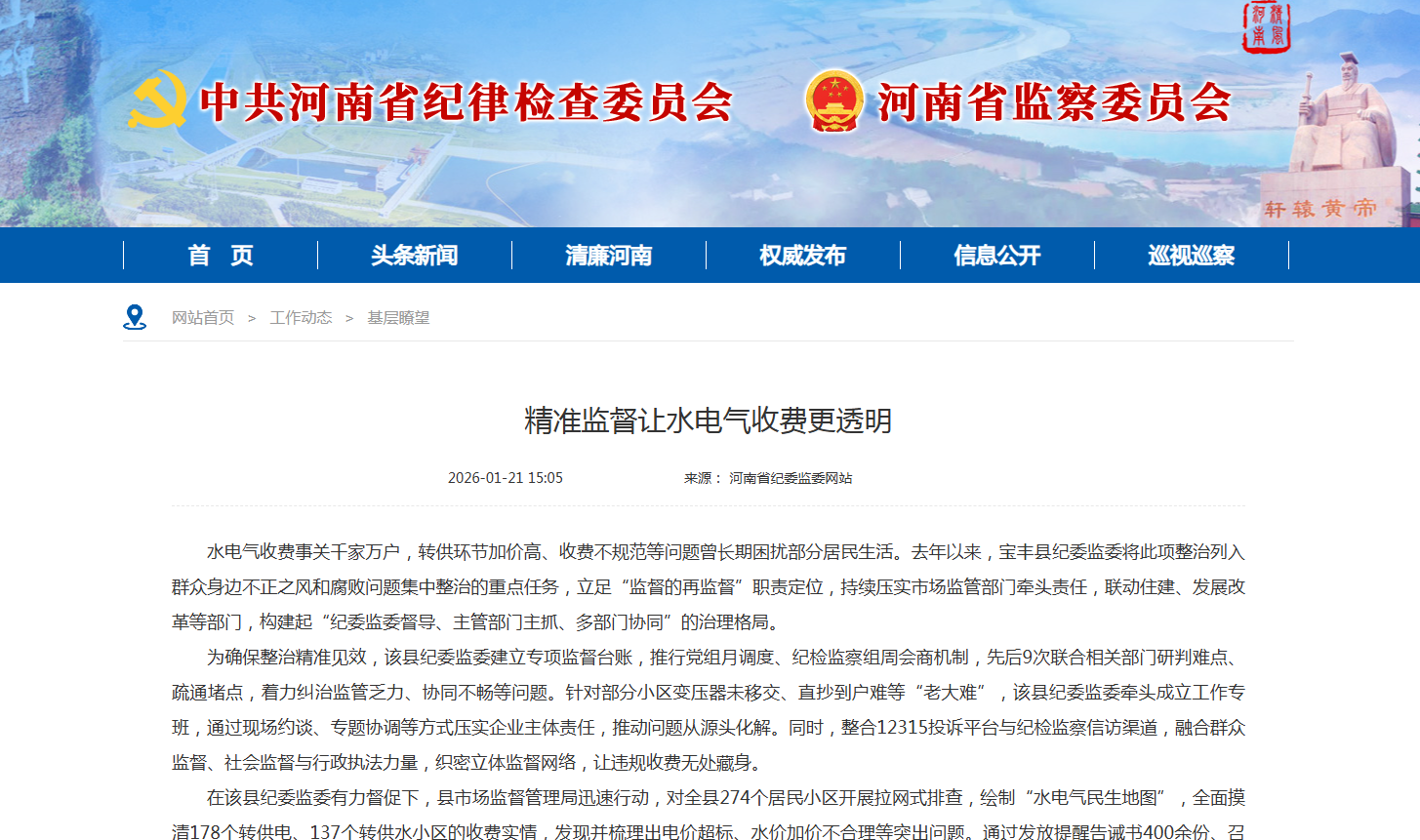 水电气收费事关千家万户,转供环节加价高、收费不规范等问题曾长期困扰部分居民生活。去年以来,宝丰县纪委监委将此项整治列入群众身边不正之风和腐败问题集中整治的重点任务,立足“监督的再监督”职责定位,持续压实市场监管部门牵头责任,联动住建、发展改革等部门,构建起“纪委监委督导、主管部门主抓、多部门协同”的治理格局。