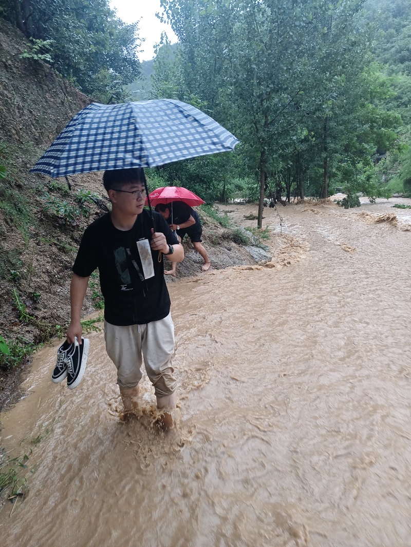 由于雨势不断加大,山上的砂石被洪水冲到了道路上,车辆无法通行,大家只好徒步涉水前行。途中该乡纪检干部党世统在“逆行”的途中衣裤被泥水浸透,多次险些被冲倒在急流中。在一步一滑的艰难行进中,不知道什么时候踩到水中碎石,因为冰凉的水和当时着急的心情他浑然不知脚上的疼痛。