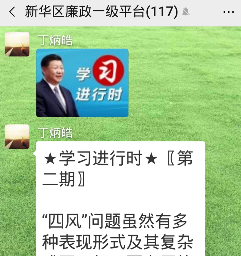 微信随时学。通过“清风新华”和“新华区廉政教育三级管理平台”及时推送相关学习材料,一级带着一级学,层层覆盖、步步深入,让学习交流既接“天线”又接“地气”。