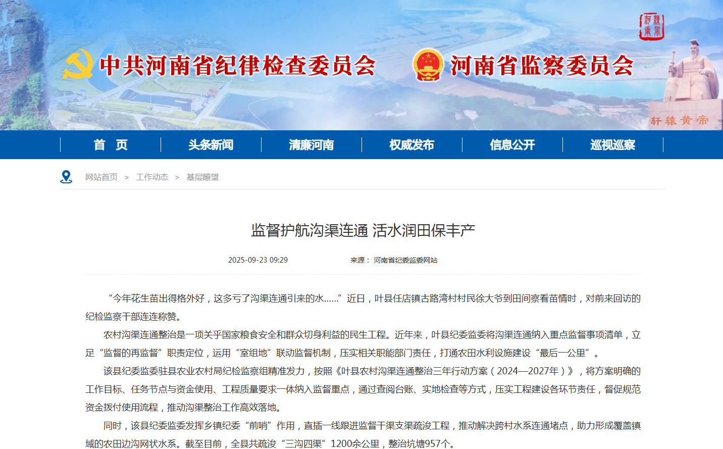 农村沟渠连通整治是一项关乎国家粮食安全和群众切身利益的民生工程。近年来,叶县纪委监委将沟渠连通纳入重点监督事项清单,立足“监督的再监督”职责定位,运用“室组地”联动监督机制,压实相关职能部门责任,打通农田水利设施建设“最后一公里”。
