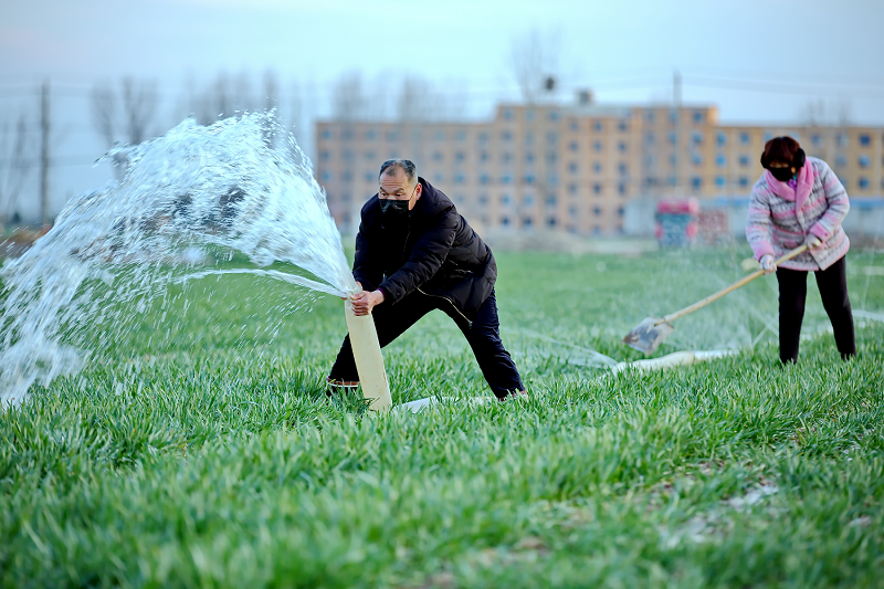 雨水节气至,天气渐转暖,湛河区河滨街道湾李村村民们按照防疫工作要求戴上口罩、保持安全距离来到田间灌溉土地,有序开展春季田管和春播作物的备耕工作。(丁罗义 摄)