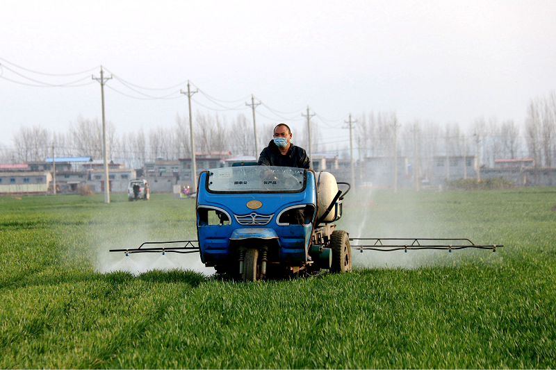 湛河区曹镇乡彭庄村集中购买农药,聘请专业植保人员为全村1600多亩小麦喷洒农药,统一进行田间管理,做到疫情防控和田间管理两不误。(王毛生 摄)