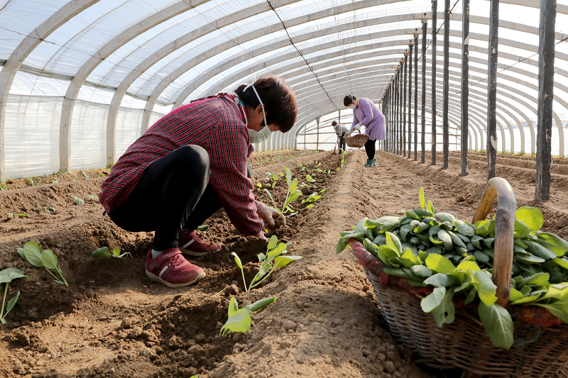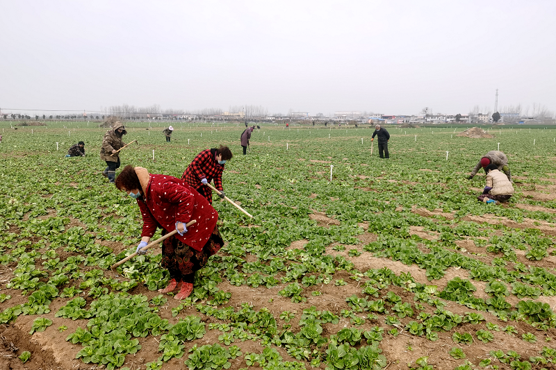 鲁山县马楼乡的万顺农业有限公司在政府支持引导下有序复产春耕,在该乡尧场村果蔬基地里,复工复产的工人们正间隔剔除作业。(杨炳辉 摄)
