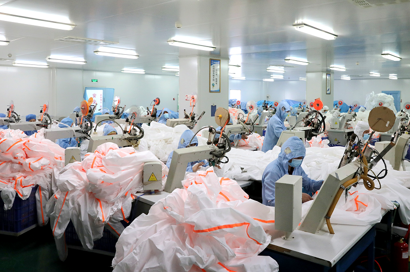 鲁山县洁利康医疗用品有限公司的全体职工从农历腊月二十六接到紧急通知后,迅速从停产状态恢复到满负荷生产,现已日产医用防护服8000套以上,有力支援全国疫情防控工作。图为生产车间内,工人们身着防护服,机器飞转,专心工作。(郭东伟 摄)