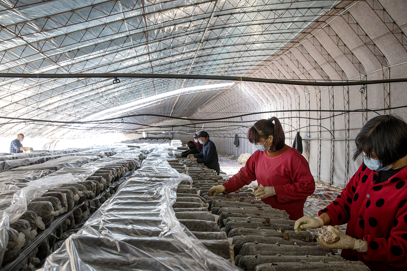 鲁山县瓦屋镇土桥村的香菇大棚里,菇农们戴着口罩拌料、装袋、蒸料、打孔、点种、消毒忙碌着,为春季香菇种植做准备。(郭东伟 摄)