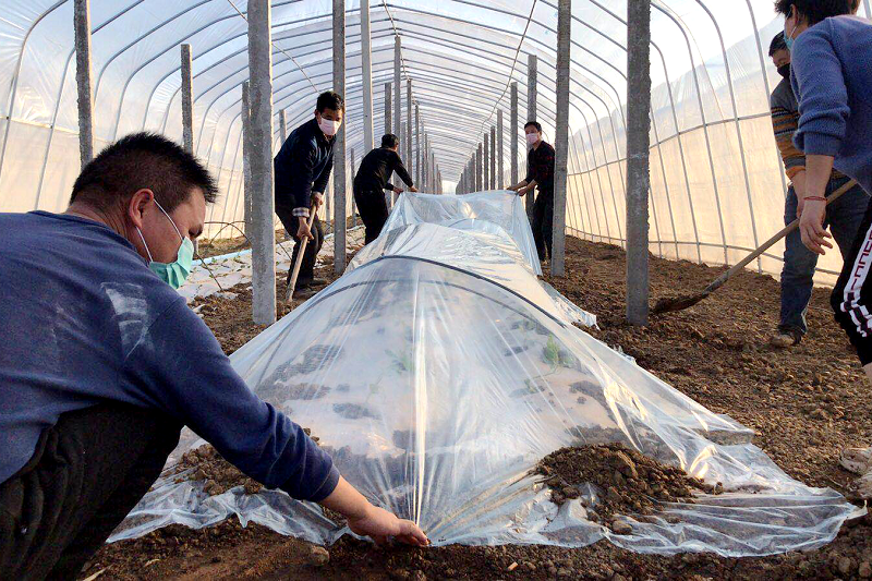 “疫情当前,不误农时。”连日来,叶县一方面抓好疫情防控工作,一方面做好春耕备播。图为邓李乡妆头村大棚西瓜种植,农户在西瓜苗定植后进行覆盖二层供膜。(张晓飞 摄)