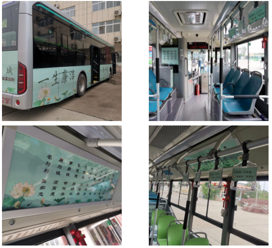 寓“廉”于“乘”、寓“教”于“行”。此专线车型为12米的“黑金刚”纯电动车,外观以淡绿色为背景,以荷叶莲花为点缀,清新淡雅,色调明快。车头标有“鹰城清风 公交专线”字样,车身两侧和车后喷涂“一生廉洁 一路平安”“和韵清风 廉洁鹰城”等标语。车厢内悬吊把手张贴了朗朗上口的“廉洁三字经”,乘客靠背介绍了“典籍里的清廉”小知识,封道屏、司机靠背板等处的“廉政数字歌”、清廉楷模及其名言警句随处可见……以图文并茂形式植入的廉洁文化让市民在潜移默化中受到熏陶感染。