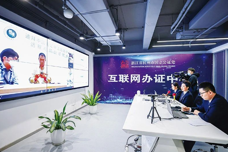 图为2022年1月21日,迪拜中国签证申请服务中心与浙江省杭州市国立公证处合作办理放弃继承声明的海外远程视频公证。司法部供图